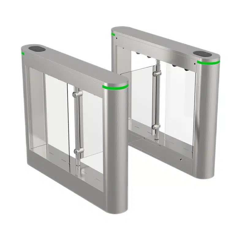 بوابة دخول حديثة وعالية السرعة بتصميم أنيق من الزجاج والفولاذ المقاوم للصدأ، تُستخدم لتنظيم دخول الأفراد في المباني الإدارية، الأبراج، البنوك، والهيئات الفاخرة.